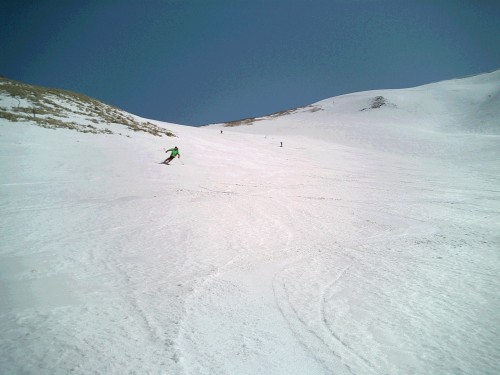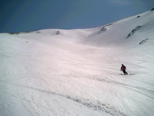 芝倉沢核心部の滑降。ザラメ風の滑りやすい雪質。