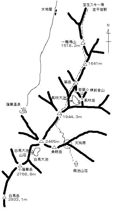 つぼ足の班もある。北に風吹岳と岩菅山のふたつのピーク。その間が風吹大池だ。