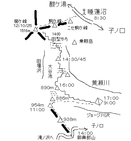 さきほどアリのように降りてきた70名位の雪訓らしき一団の前を通って空身で櫛ケ峰へ登る。今までいた山スキーヤーも消え、見渡す限り我々ふたりのみ。三角点付近は土が出ていた。直下の社は1977年の秋に見た時には頂上からもっと離れていたと思ったのに数mの距離だった。屋根の一部が露出。シールを腰に滑降。もう少し締まっている時に滑りたいがやむを得ない。窪地でテントを張り昼食。 田型やちを確認して基点にしようと東にトラバース。一部露出していてそれと判明。道標は出ていない。田堰沢と黄瀬川の間の尾根線上で広葉樹に囲まれていた旧道はどこなのか不明。オオシラビソの林が一番広くあいているところを下る。コメツガが混じっている。 1200m〜1100m付近で黄瀬川に寄りすぎたので沢を2本越して修正。尾根の東側、ダケカンバが混じってくる。1050m付近で再び東に寄って南下すると、980m付近で夏道上へ出た。大谷池の東端の針葉樹の森に道が続いている。大谷池は雪の下だが道標1本とツゲが露出している。930m付近、大谷池のはずれで、切り開きを見失い、東に進んでしまうが、西にトラバースして、ほぼ夏道沿いに進んだと思う。エッジのあとが潅木にかなりついている。 890m峰あたりに「五所川原林道入口」があったはずだが、それを見出せなかった。更に886mの標高点まで来ているつもりで890m峰から東南東に進んでしまった。翌日の状況からみてジョージ川沢の北、764mの標高点付近にて幕営。このあたりもエッジのあとが多く、五所川原に抜ける人が居るのかもしれない。あさってまで晴れ。 |