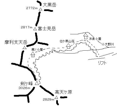 コースタイム 出発 7:15 → 自動車道路 8:00/07 → 肩の小屋 8:35/ 50 → 朝日岳 10:00 → 剣ケ峰 11:15/25 → 肩の小屋 12:25/13:00 → 幕営地 13:40 |