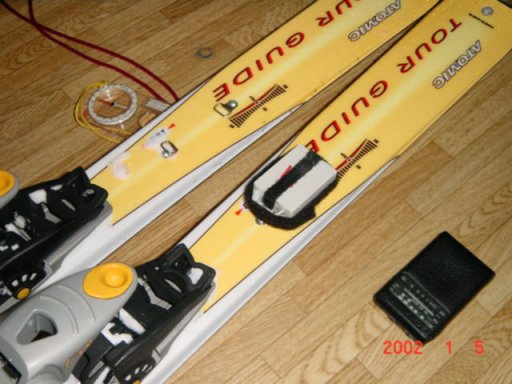 「自作スキービーコン」 T氏は山スキーのバインディングに付き物の「流れ止め」が気に入らないらしく、スキービーコンを密かに自作していた。 流れ止めで痛い目に遭ったのが製作のきっかけらしい。 スキービーコン自体はオルトボックスなどのビーコンメーカーから商品として出ているらしいが、日本では売ってないらしい。 「スキービーコン」と勝手に名前を付けているが、要はパウダーで転倒してスキーが埋没したときなどに使うのが目的である。 今回、嫌がるT氏の許可を得ず勝手に写真を撮って公開してみることにした。 T氏は自慢のスキービーコンを取り付けるため、おろしたての板にビスで穴を開けているのが分かる。 でも「H」ってなに? 下の写真は板に固定したところ。 バンドでぐるぐる巻きにするという近代的な手法を用いているのがわかる。 ビーコンは発信専用であり、AMの周波数帯で発信するように調整されている。 これによって市販のラジオが受信機になり、約5m程度が受信範囲となる。 左右のビーコンは発信周波数が同じなため、その区別はビーコンが発信するラジオの音で聞き分けるらしい。 ビーコンの電源には単5型の電池が使用されていた。 製作者曰く、「キットの販売はしていない」とのこと。 スキーをよく無くす人は付けてみてもいいかも!? 以上 |